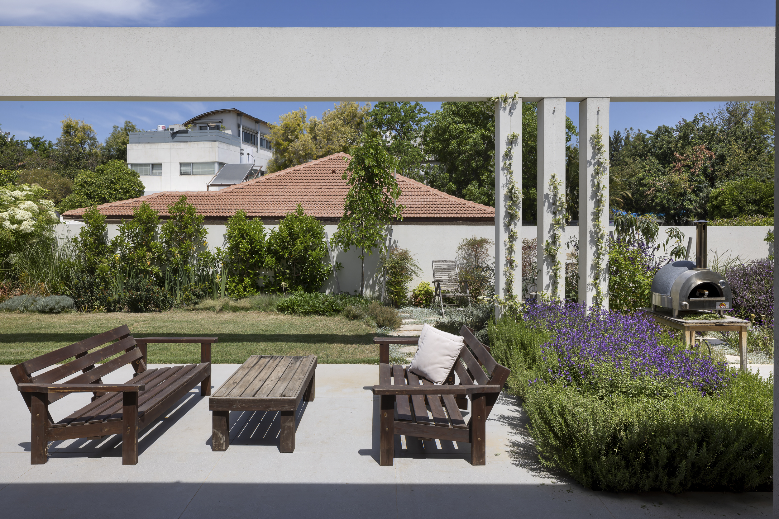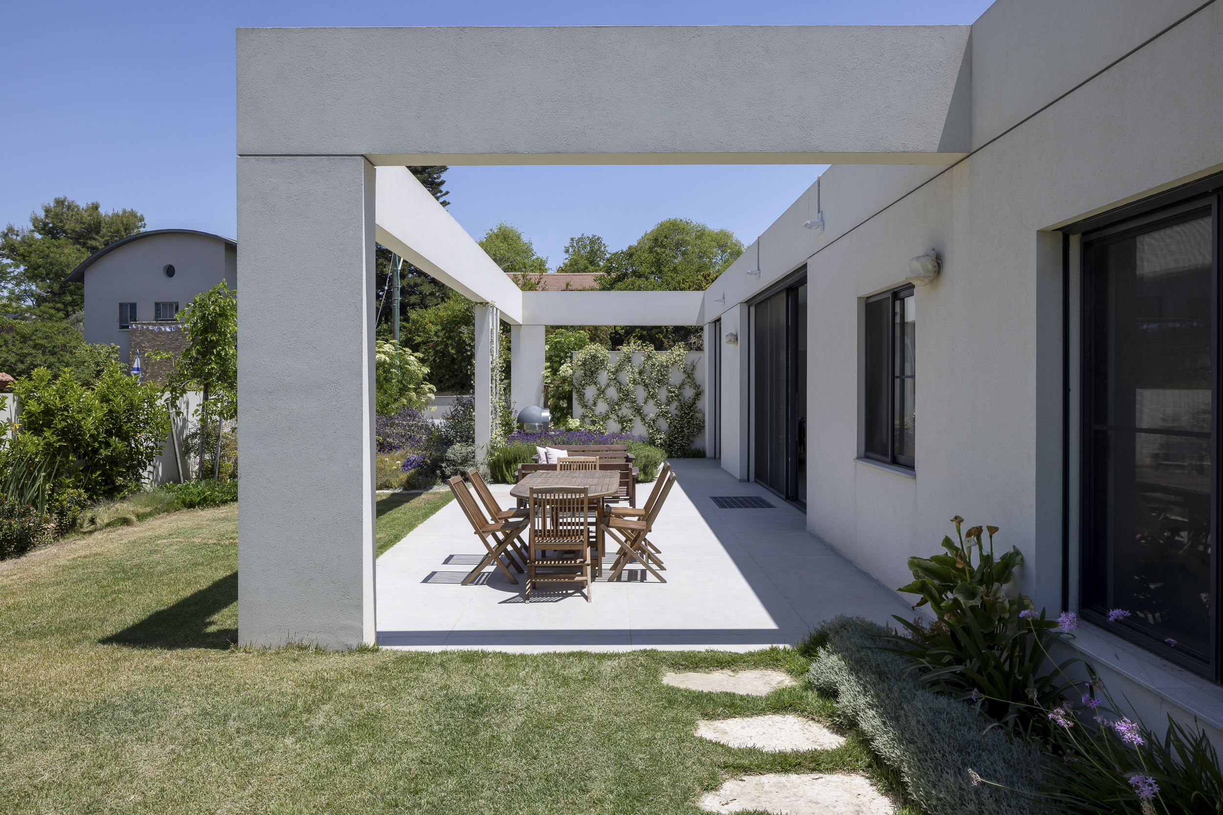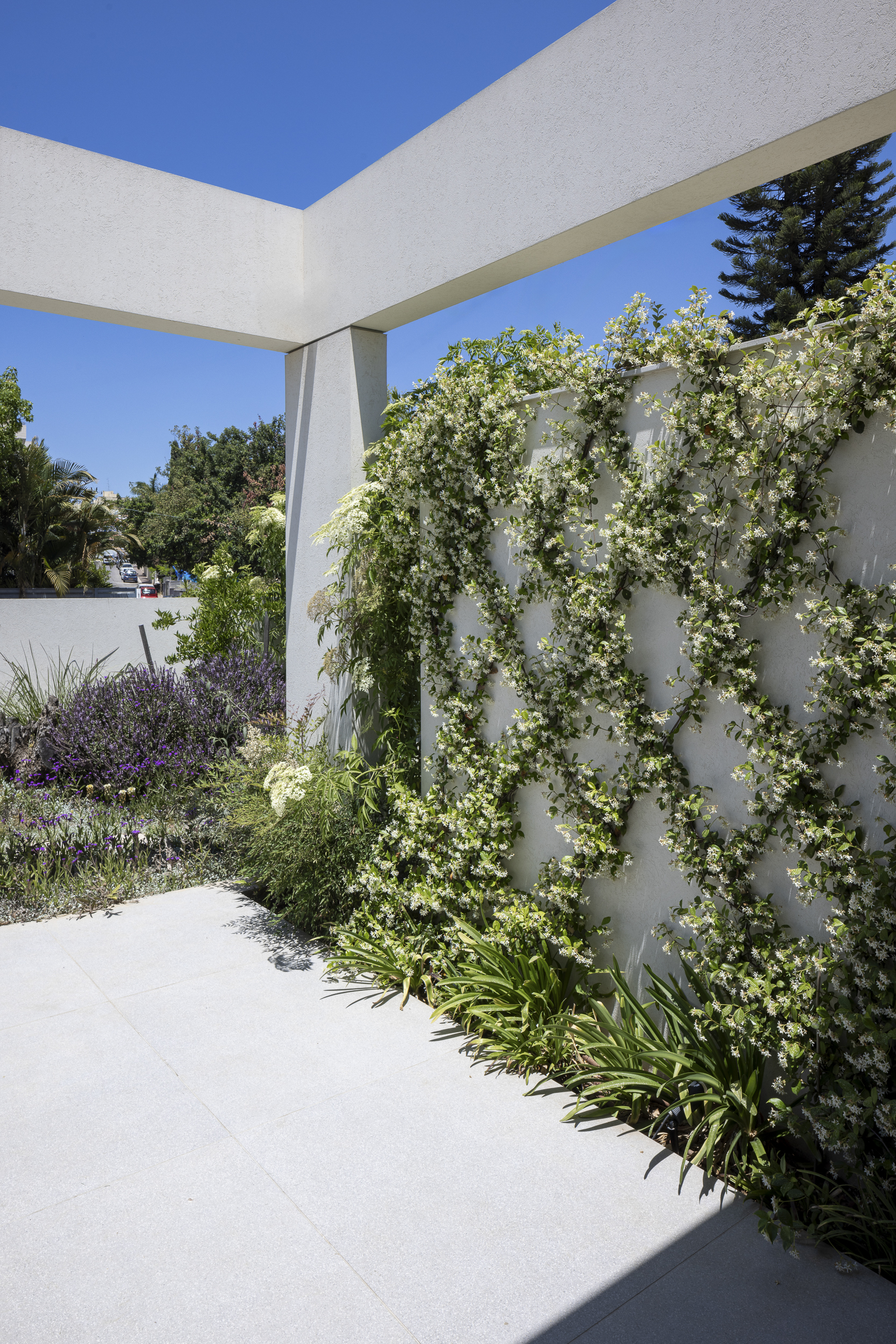 שלד בטון נקי ופתחים רחבים פוגשים צמחייה ים־תיכונית עשירה המטפסת על העמודים, נשפכת מעל הקירות ומייצרת משחק של אור, צל ותנועה לאורך כל שעות היום.